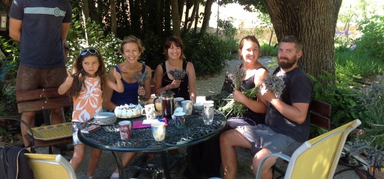 Today was Emah’s birthday. She is third from the left holding a bunch of Lavender and wearing a big happy smile. Maybe that is something to do with with the scrumptious coffee meringue cake which she is about to slice into. Emah and Jill ( sitting on her right) hail from Vancouver, Canada, they are in the of midst of a round the world journey. We feel very privileged that they stopped off here for a few weeks . In this photo, Janet and Alex are also holding lavender posies while little Amelie gives the thumbs up sign. She is really waiting for someone to cut the ice cream cake. Giles, her father, is smiling benignly at either the cake or his daughter. He tells us that he does not normally tuck into treats like this but he is making an exception because the cake has come from La Sirene, where, as he points out, they know how to make a cake to perfection. To celebrate the birthday, we sat around the table in the shadiest part of the garden, Baloo’s favorite spot, and marveled at the skill of the local patisserier La Sirene. Emah & Jill are working and winding their way around the world. Though they look petite and slender, don’t be fooled they can lift heavy loads and are ready to get stuck into whatever needs doing. Whether it is evacuating building rubble or helping icky create her much awaited blog!
